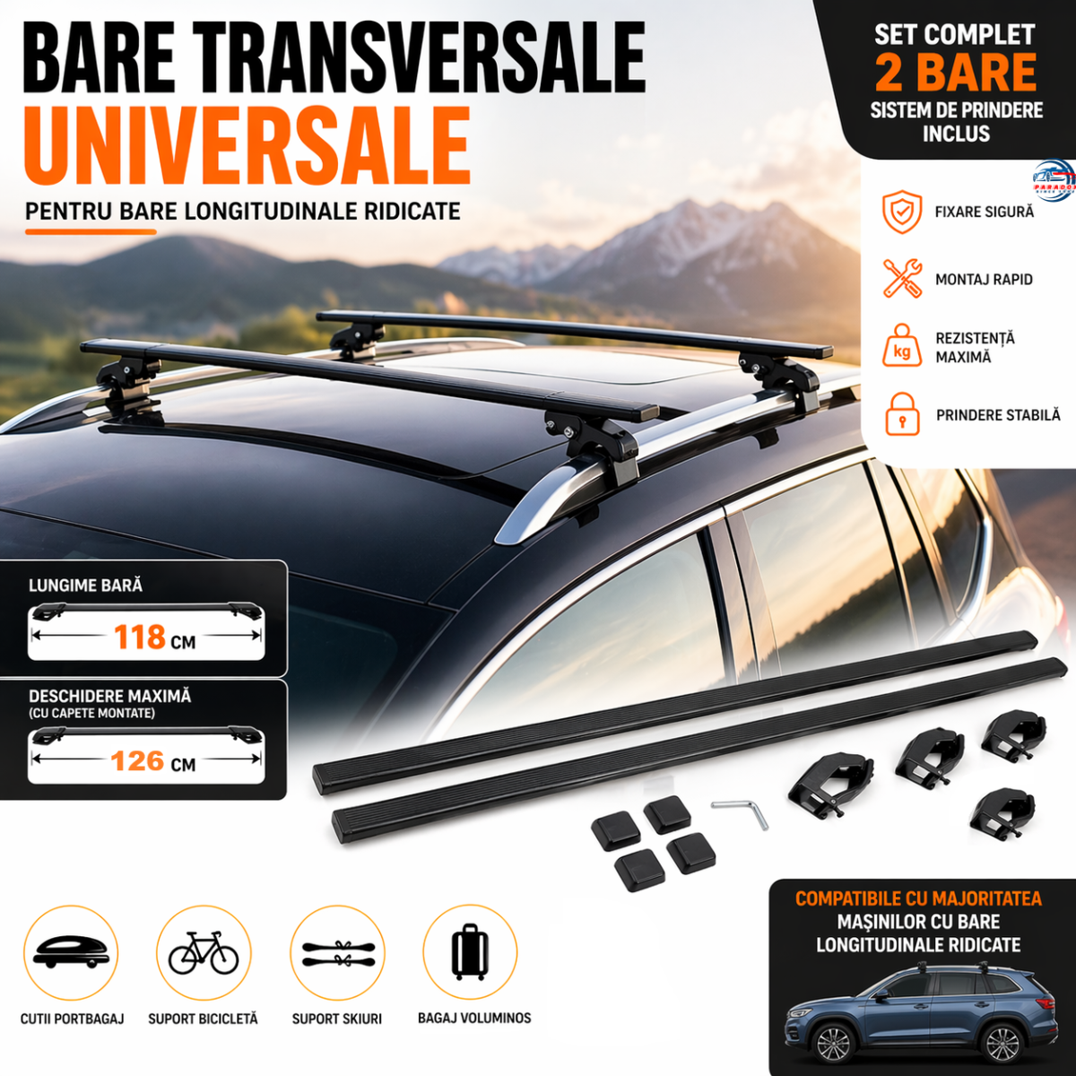 Modelul are deschidere maxima de 126 cm dupa montarea capetelor de fixare, ceea ce il face compatibil cu o gama larga de autoturisme, SUV-uri si modele break prevazute cu bare longitudinale.